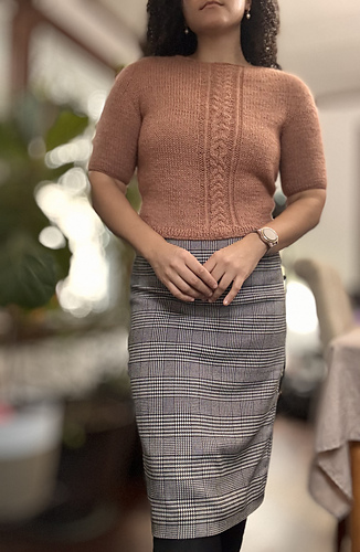 The Anais tee has a boat neck, short sleeves, and a fitted silhouette. The neckline is shaped by working short rows. Worked from the top down and seamlessly by using the contiguous method.