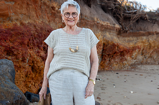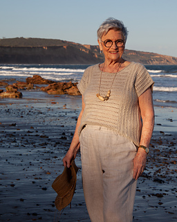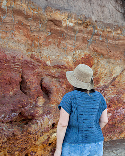 This summer top has a modular construction that explores directionality and texture. The striped all-over lace pattern highlights the changing directions.