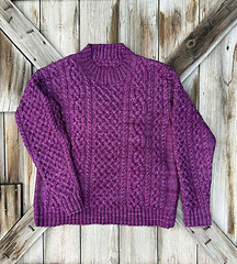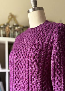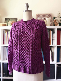 The Anise Pullover features a standard fit with slightly dropped shoulders and set in sleeves. The cable pattern has a center motif with repeating cables on either side. This sweater is knit flat from the bottom up in separate pieces then sewn together. The neck trim is knit on using circular or double pointed needles.