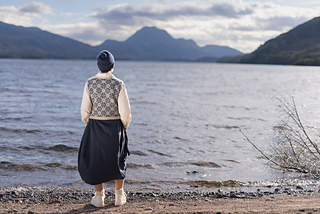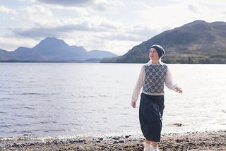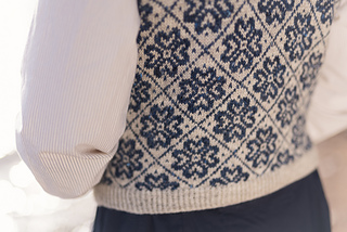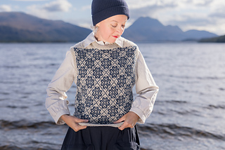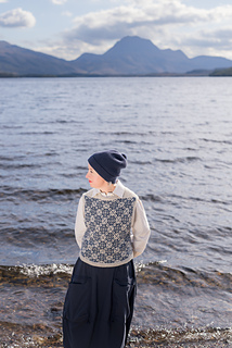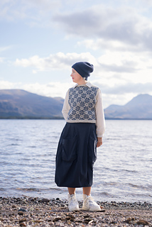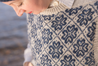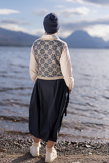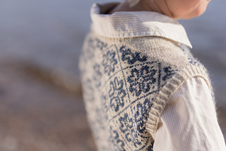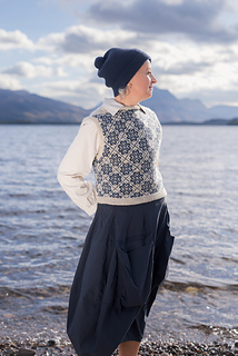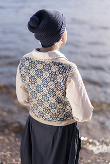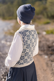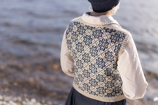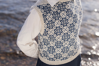 Worked from the top down, this vest begins by knitting two epaulettes, from which stitches are picked up to form the shoulders and neckline. A steek is inserted at the top of each armscye, and the upper body is worked from a colourwork chart. Stitches are increased to shape each underarm, the steeks are bound off, the lower body is worked to the length required, and the hem completed with twisted rib. The steeks are cut open, and stitches are picked up all around each armscye, and finished with twisted rib. A twisted rib neckline completes the vest.