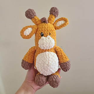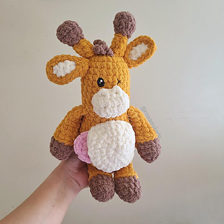This is a crochet pattern for this little giraffe stuffed toy. The body is made in one piece and all the details sewed on later. If made with the recommended yarn (Bernat blanket) and hook, they toy will measure approximately 10” sitting (from the top of the ossicones to the bottom of the body). The belly can be left open on one side to make a small pocket.