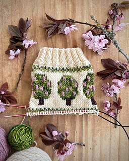 colorwork pattern borders the trees and is repeated just before the toe decreases. If you are not a fan of apples, you can even knit the bobbles with peach-colored yarn and make