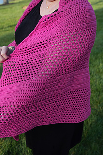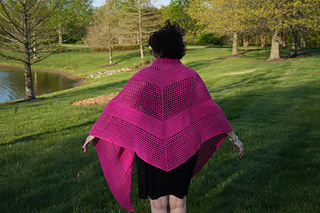 April Trellis Shawl is a triangular shawl crocheted top down. It alternates solid double crochet with double crochet, chain one mesh. It is a beginner level pattern.