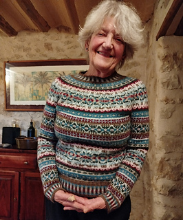 Ardella is knit in the round from top down to yield a seamless sweater using fingering weight yarn. The Fair Isle stranded design in 8 contrasting colors uses charts that are repeated for a symmetrically balanced sweater. Ardella is designed with fitted sleeves and is recommended to be worn with 4 to 8” / 10 to 20 cm positive ease.
