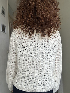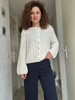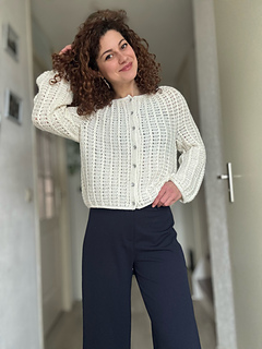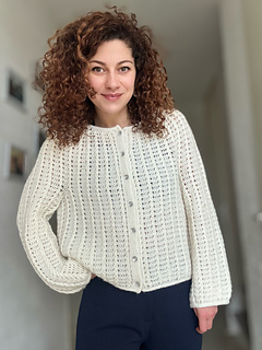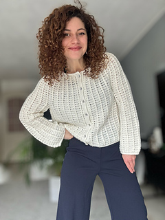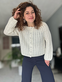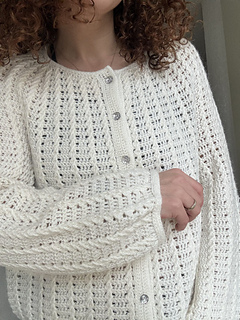 The Aria Cardigan is a top-down crochet cardigan featuring a round yoke construction and a beautifully textured cable stitch pattern that flows seamlessly throughout the entire garment.
