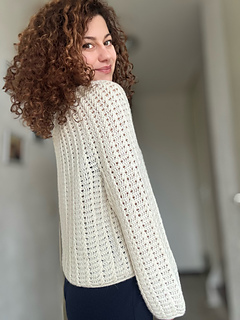 The design includes an anatomical neckline, shaped with short rows that blend naturally into the stitch pattern for a clean and refined finish. The relaxed fit creates a flattering silhouette that follows the body without feeling restrictive.
