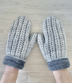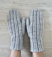 A good pattern does not have to be complicated. Sometimes all you need is a pretty stitch. The stitch pattern also provides thickness to the mitts, making them warm. They are flexible and stretch well because of the ribbing and the sizes range from small to large, so you can make matching mitts for the whole family.