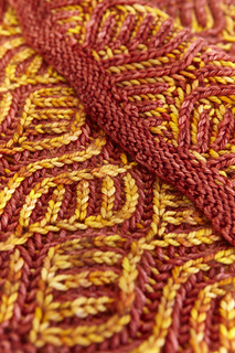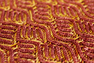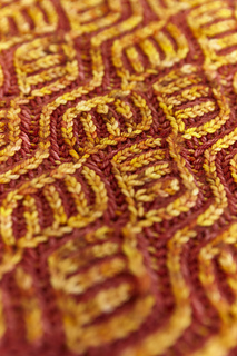 The Arkitexture cowl captures this architectural poetry in two-color brioche. Wavy vertical columns and interlocking lattices create rhythm and movement. They contrast against the deep rosy red background that provides foundation and warmth. Golden threads catch and release light, mimicking how sunlight plays through architectural lattice.