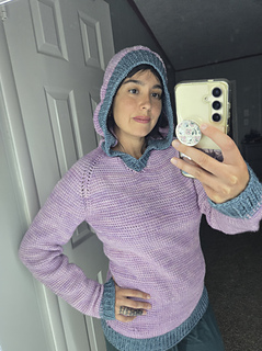 The Artist Hoodie is worked almost seamlessly from the bottom up. The sleeves and body are worked in the round from the cuff to underarm. The body and sleeves are then joined and worked in the round until the v-neck. V-neck shaping and hood are worked flat. Pouch is worked flat and sewn on. Instructions are included to adjust the sleeve and body length.