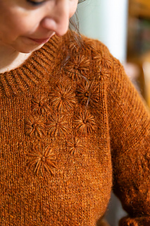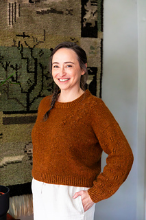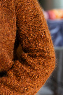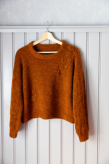 Mallipaita on neulottu Jalovillan Vuonalla (100 % suomalainen lampaanvilla, 205 m/50 g), sävy 4075 Pronssi sekä Lang Yarns Lace -langalla (58 % mohair, 42% silkki, 310 m/25 g), sävy 0015.