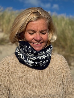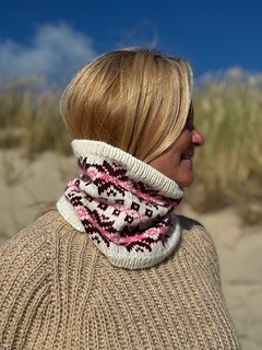 The cowl is worked in the round on circular needles. It is worked using the magic loop method, but can of course also be worked on a shorter circular needle or with double-pointed needles if preferred. Begin with a rib edge in the main color, continue following the chart, and finish with a rib edge.