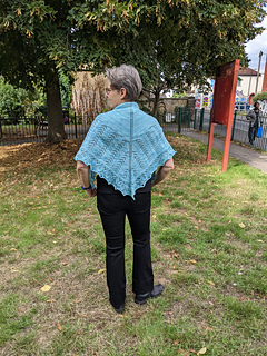 A triangular shawl knitted top down in one piece. Cast on is at the centre of the back of the neck. The body of the shawl consists of garter stitch with a narrow garter stitch edge along the top edge of the shawl throughout. There is an undulating lace border, which is followed by a leaf lace edging. The edging features large triple yarn overs which can be blocked to form a scalloped edge.