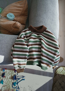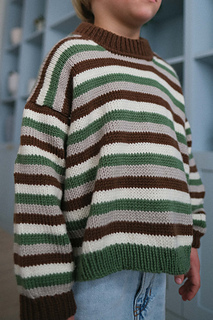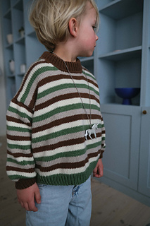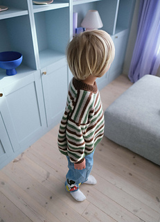 Pictured in Pop Merino size 6-7 on a boy almost 6 years old (knitted a little shorter in the body) in the colors: Teddy Bear brown (color 1), “Coconut white” (color 2), “Oat Milk” (color 3) and “Olive garden”