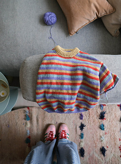 Simple knitting pattern for a sweater for children with nice details and fit. The sweater is knitted from the top down. You start by casting on stitches at the neck and knit back and forth while increasing on each side, to get a nice fit over the shoulders. When the back piece is finished, knit the front pieces by knitting up stitches from the back piece. The front and back pieces are knitted together after the sleeve opening is finished. The sleeves are knitted from the top down, you knit up stitches in the sleeve opening on the body.