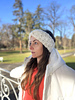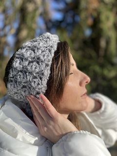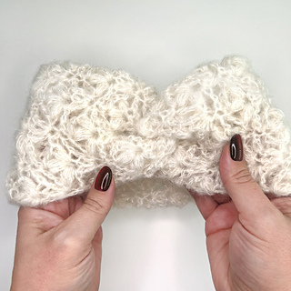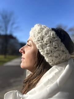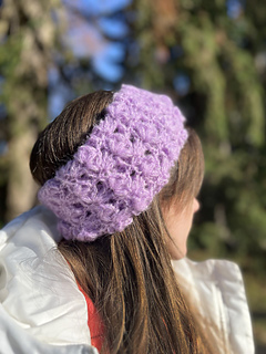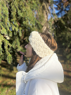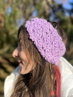 The construction is simple and satisfying: a textured lace panel that’s folded for extra warmth and finished with a clean, twisted join. No complex shaping — just a thoughtful construction that turns a flat piece into a polished, comfortable headband with a beautiful halo effect.