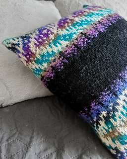 The glowing Northern Lights, seen in many accessories, now appear on a pillow cover as well. A gradient-dyed yarn echoes the shimmer of the sky, while a dark forest stands steady in the center and the mysterious scene is reflected on the surface of a lake. The pillow cover is worked in the round as a tube and sewn closed at the ends.