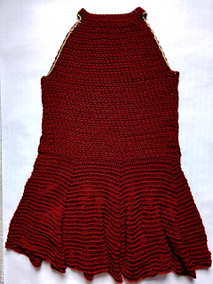 This garment is worked top-down starting with the neck ribbing, then the 2 panels worked flat, then joined on the go to carry on with waist and finally the 6 pointed star skirt.