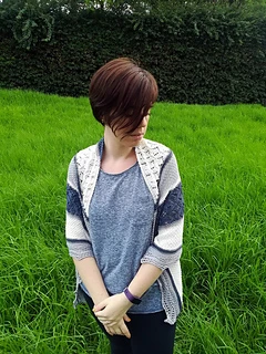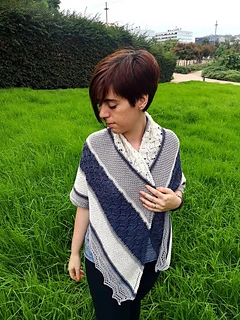 This shawl has a triangular shape; it is knitted on circular needles and a long cable so all the stitches fit better. There are easy parts in garter stitch and wheat stitch, and more elaborate parts, although still easy to work, in openwork stripes. It allows for multiple colour variations.