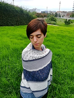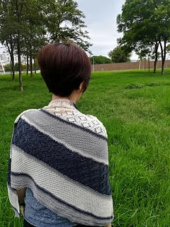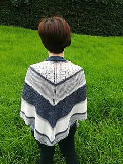 Este chal tiene forma triangular; se teje con agujas circulares con cable largo para acomodar mejor los puntos. Tiene partes más sencillas en punto bobo y punto de trigo, en contraste con franjas de calado más elaboradas pero fáciles de realizar. Admite múltiples variaciones en la combinación de colores.