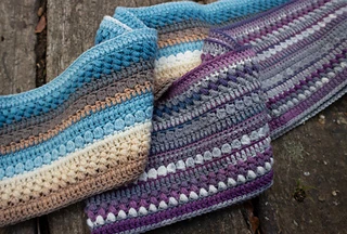 The original Autumn Skies Infinity Scarf has a width of 18cm and length of 160cm. The pattern is adaptable to any length using stitches in multiples of 2.