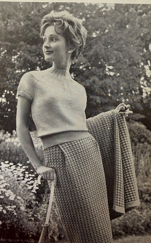 Measurements: To fit a 32 (34, 36) inch bust (actual garment measures 34 (36, 38) inches; length at centre back, 20 (20.5, 21) inches; sleeve seam, 2.5 inches.