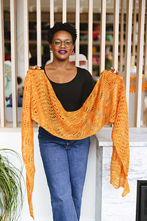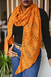 This wrap was made in collaboration with Less Traveled Yarn. The sample pictured uses 2 skeins of s’mohair yarn in Pumpkin.