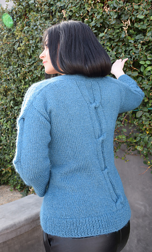 The back, fronts, and sleeves of this cozy jacket are worked from the bottom up, beginning with a Tubular Cast On and 1x1 ribbing, changing to a cable, following the ribbing. Each sleeve is 3/4 long, ending in a saddle shoulder. An unusual Tie Cable runs up the middle of the back, as well as up the middle of each sleeve into the saddle shoulder. The front band is worked in conjunction with each front, and continues around the back of the neck, where it is seamed at the center back neck with a 3-needle bind off.
