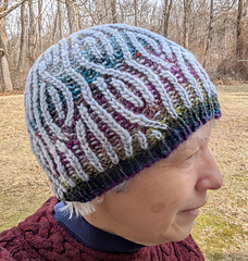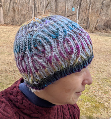 The beauty of working a hat in two-color brioche knitting is that it can be worn on either side. Increases and decreases combine to create a faux-cable pattern. Shown here is the darker shade of KUREYON #263 Ninohe as the main color. Wear it with #211 Kani on the outside for a more subtle look.