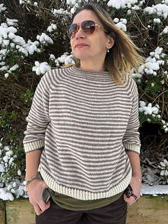 The BABA sweater Chunky is worked seamlessly from the top down in 2x2 stripe pattern (2 rounds - 2 colors) throughout. Start working the collar and then increase for yoke. Then the yoke is worked with raglan increases to sleeve separation. The sleeve stitches are then placed on hold, underarm sts are cast on, and you continue to work the body to the bottom. After the body is completed, the sleeve sts are picked up again to work the sleeves top down in the round to the end.