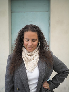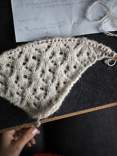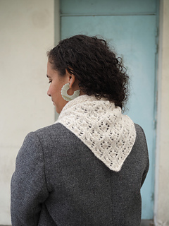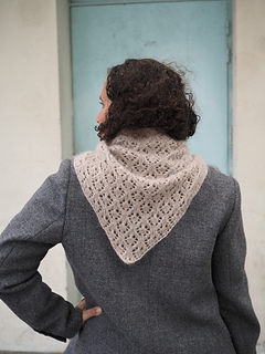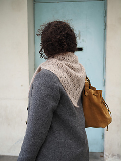 It’s knitted from the point up, making it easy to adjust the size to your desired dimensions or the amount of yarn you have. The lace stitch requires concentration but is easy to knit (knit and purl stitches, yarn overs, decreases). The stitch pattern is provided in both written form and as a chart.