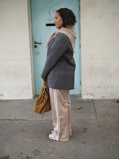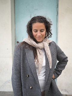La version 2 est tricotée en Super tweed (100% super fine merino wool – 50 g = 350 m) de Majo Garn couleur 106 linen et un fil de Pearl Mohair (70 % super kid mohair, 30% soie – 50g = 210 m) couleur 101 Oatmeal de Majo Garn plus un fil kms (kid mohair soie - 50g = 420 m) de Yarn By Simone couleur Jon snow.