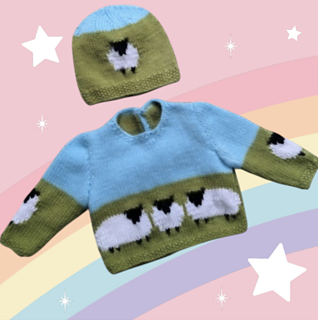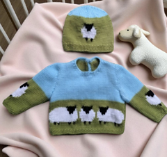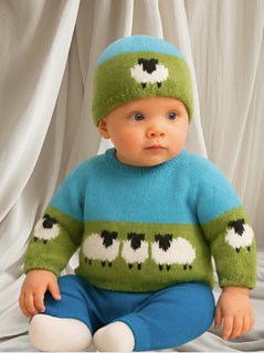 This cute knitting pattern is designed for children from birth up to 18 months. It features adorable sheep motifs: three on the front of the sweater, three on the back, and one on each sleeve. The delightful combination of colours makes the project both fun and interesting.