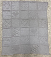 Diese Babydecke wird in einem Stück gestrickt und besteht aus glatten und gemusterten Quadraten. Die jeweiligen Muster wiederholen sich zwei- bis dreimal innerhalb der Decke. Es werden 5 Quadrate in der Breite und 6 Quadrate in der Länge gearbeitet. Umrandet werden diese Quadrate mit 10 Reihen und 5 Maschen kraus rechts. Die Decke wird nach Strickschriften gearbeitet.