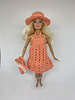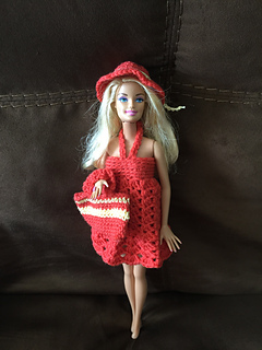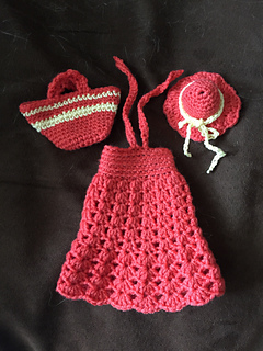 This cute sundress is worked from the neckline down to hem using basic crochet stitiches. It has a flared skirt and simple tie fastening at the neck. The dress will fit any 12” fashion doll.