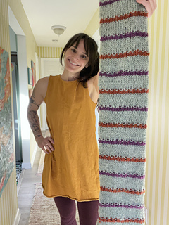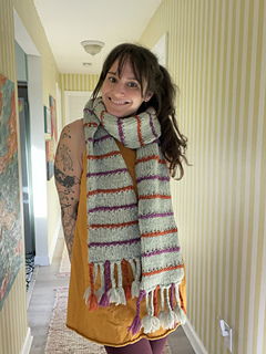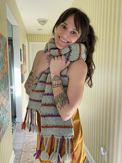 The Barcliff Scarf is a chunky knit colorwork tubular scarf perfect for layering in crisp weather. The design features solid stockinette with textured stripes in contrasting colors with accent braids on each end. Knit up in Wooldreamers Manchelopis unspun yarn the Barcliff Scarf is lightweight while being warm and cozy all at the same time!