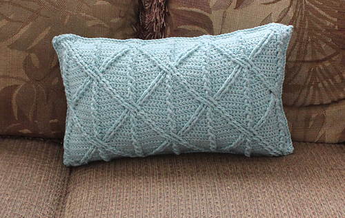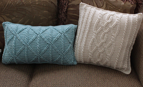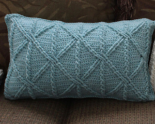 This geometric cable pillow is the perfect modern accessory for your living room. The contemporary diamond motif includes diamonds overlaid on vertical stripes of delicate 2-cross cables. Pillow has a matching throw blanket pattern and baby blanket pattern. The diamonds are made by post-stitches and joined by cable stitches.