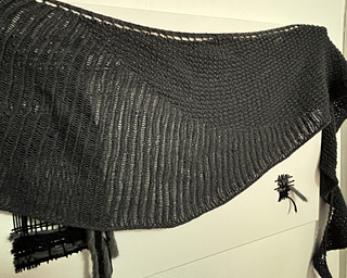 Barnistra shawl starts with garter tab cast-on with increases along right and left sides, both on the right and wrong sides. After the cast-on you work garter slip stitch pattern, and later half twisted rib is included. Since the gauge is not the same in two different stitch patterns, the final appearance of the shawl is asymmetrical.