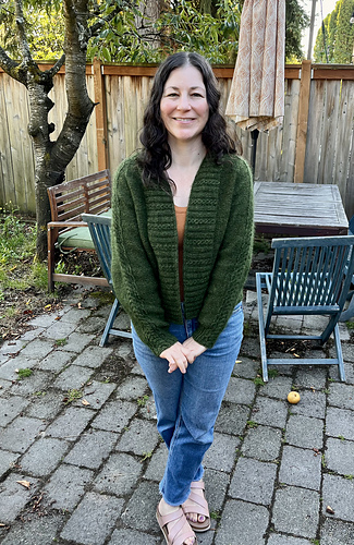 A cardigan with twisted ribs on the back, cables along the sleeves and a wide neck and front band. Button holes are integrated in the stitch pattern of the front band.
