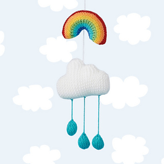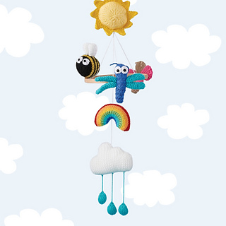 Make baby’s bedroom come to life when you create this enchanting summer mobile. Decorated with colourful bugs (bee, dragonfly and butterfly) with a sun, rainbow and rain cloud. The mobile is made by suspending the characters from an embroidery hoop, which is a cheap alternative to mobile making kits. Embroidery hoops can be bought up for a few pounds from most good craft stores. Designed by Amanda Berry @fluffandfuzz, the mobile is knitted in DK acrylic yarns on single pointed needles (not in the round).