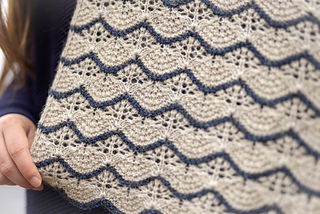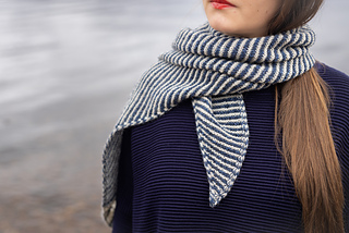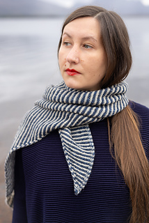 This hap is knitted, back and forth, all in one piece, in two contrasting shades throughout, from edge to tip. First a deep, decorative border is worked in scallop-shell lace, then the body of the hap is worked in simple garter stitch stripes. Decreases along one side create an elongated triangular shape, while a two-tone braided edge is created at the end of each row with slip stitches.