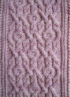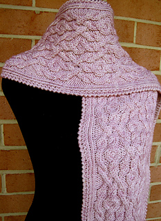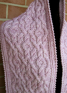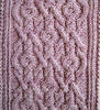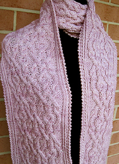 If you love knitting intricate cables, you’ll love knitting this scarf. The scarf combines a very distinct cable which is bordered by a knit/purl stitch that shows off the focal cable. The scarf is knitted with light weight worsted yarn and is warm enough for the coldest day. Ornately knitted cables give the FO depth and warmth..This cable comes to us from Canada and the creative mind of Annie Maloney.