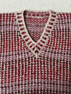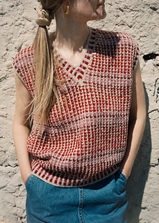 The sleeveless sweater is worked flat from the bottom up. The back and front are knitted separately and seamed together. Pattern A is worked at the ribbing, and Pattern B is worked across the entire back and front.