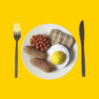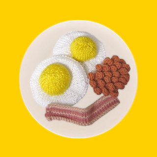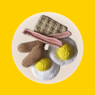 Designed by Amanda Berry @fluffandfuzz, the breakfast is knitted in acrylic DK yarns on single pointed needles (not in the round).