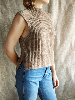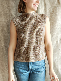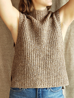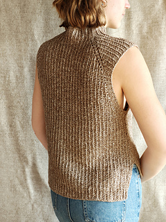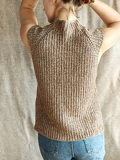 Tunesisk hæklet vest, hakket oppefra og ned. Den er lavet med en turtleneck i et fint rib-mønster og med raglan-skuldre. Den har kanter lavet i tunesisk hækling/hakket.