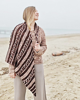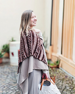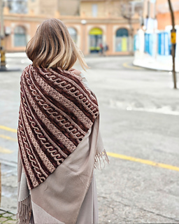 The shawl is worked sideways, from one corner to the opposite edge, and is easy to adjust in size. It alternates between three stitch patterns - crochet cables, textured diamonds, and ribbing ridges - and two colors. This not only makes the cables stand out, but also makes the pattern easier to understand and follow.