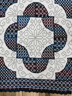 Since two contrasting colors are used to create the designs on the different “quilt blocks”, a YouTube tutorial is also included to explain changing colors on a diagonal or curve, with a review of changing colors in a straight line.