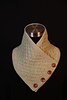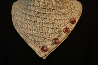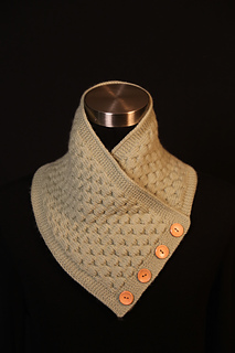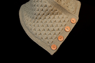 The cowl is lapped and buttoned into a V at the front. Placing buttons on both sides of the fabric allows the wearer to flip the cowl and wear it either way. The pattern offers an option for yarn-over buttonholes, or you can omit the buttonholes and just attach the buttons through both layers of the fabric to keep the cowl permanently lapped.