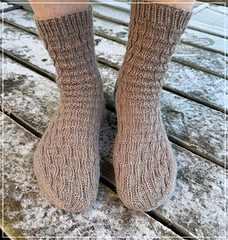 Damestørrelse med legg, teststrikket i Hot Socks Pearl, sammen med Kid Silk på pinner 2,75 mm. Lengde legg: 14 cm. Lengde fot: 22 cm. Garnmengde: 66 gram Hot Socks Pearl og 34 gram Kid Silk.