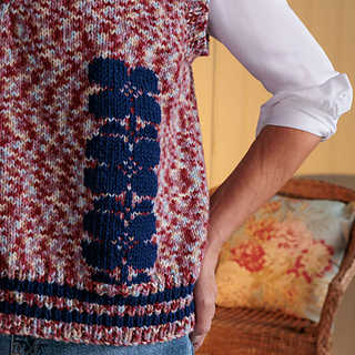 Duplicate stitches are in bloom on this knit vest from Red Heart Super Saver Jazzy.