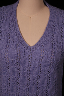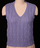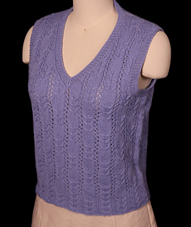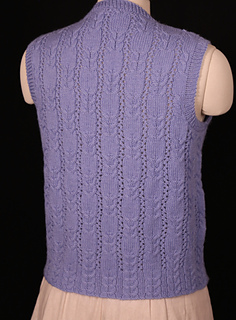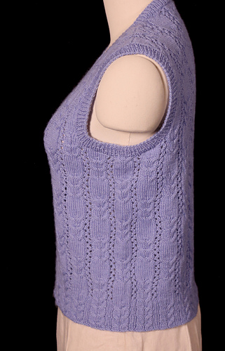 I am always looking for interesting stitch patterns employing cables or lace—or both—and the Japanese Knitting Stitch Bible by Hitomi Shida, which I’ve used here, provides me with lots of possibilities. I also enjoy knitting vests since they offer a canvas for experimentintg with stitch patterns in a size that is manageable and not too complex—no sleeves! This pattern, incorporating a simple 4-stitch lace pattern with an easy-to-remember cable pattern allows me to indulge in all of my favorite things.